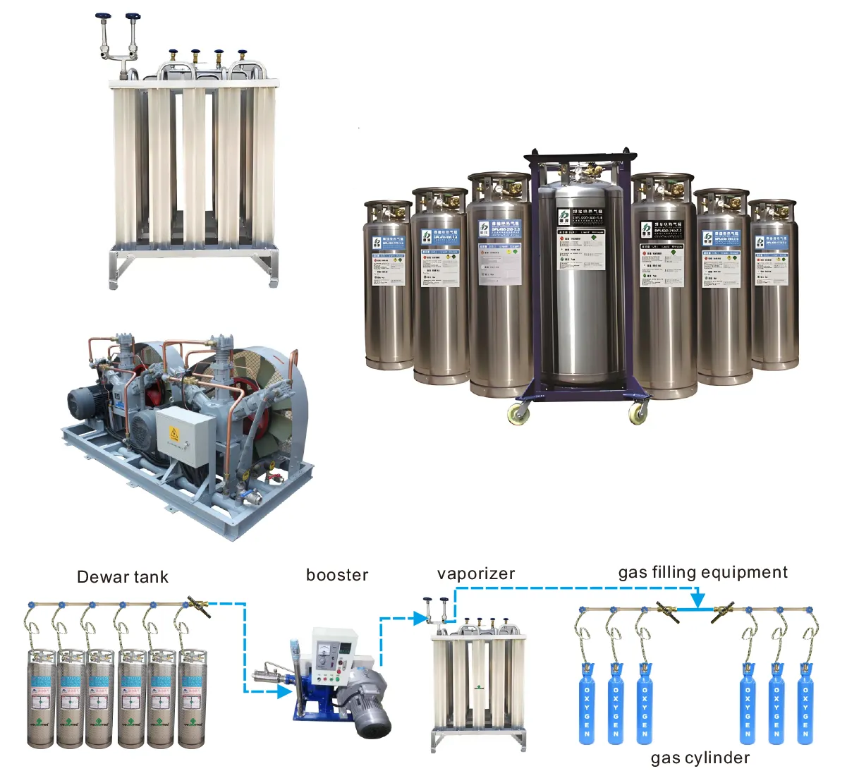 Amcaremed likido likido likidoen biltegiratze sistema likido likido likido kriogenikoa, likido kriogeniko zilindroaren zilindro ponpa, lurrungailua, gasaren presioa arautzeko eta kolektorea betetzen ditu.